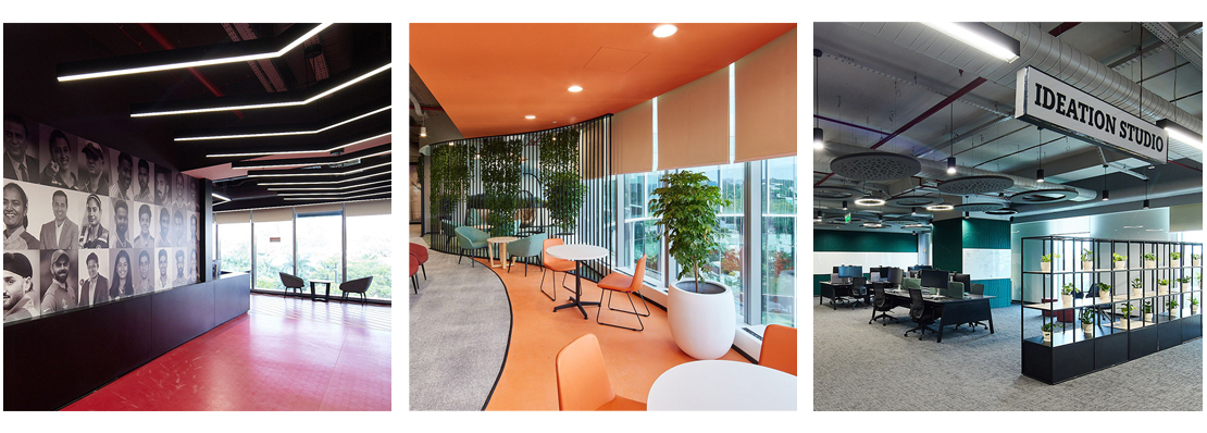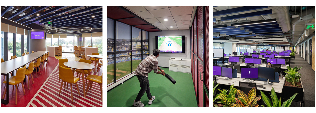Wellbeing and social spaces include yoga and gaming zones, cafés, and flexible event areas that can be booked for team celebrations and cultural activities. The Cricket Zone is a standout entertainment feature providing indoor cricket space, inspired by India’s love for cricket and NatWest’s long-standing sponsorship of the sport. Biophilic design throughout the scheme is achieved through integration of natural materials, greenery, and colour palettes inspired by the vibrant local culture.
